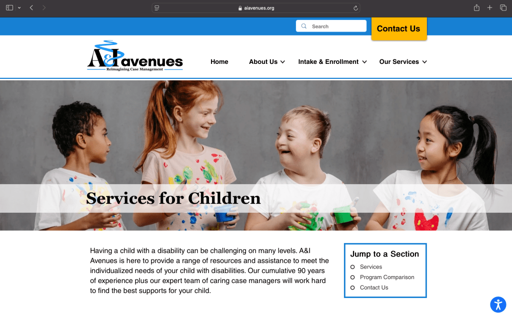 In addition to the website build, I also helped troubleshoot DNS connections for a third-party app called Wayfinder, which was essential for enhancing the agency’s location and mapping features. This project not only involved technical problem-solving but also reinforced the importance of accessible design at every stage of the development process. The final result was a strong brand identity paired with a user-friendly, accessible website that met the agency’s needs and values. To view the live website, please click on the following link: A&I Avenues Website