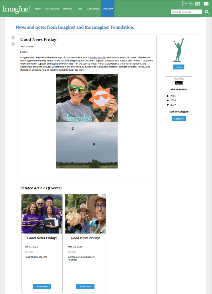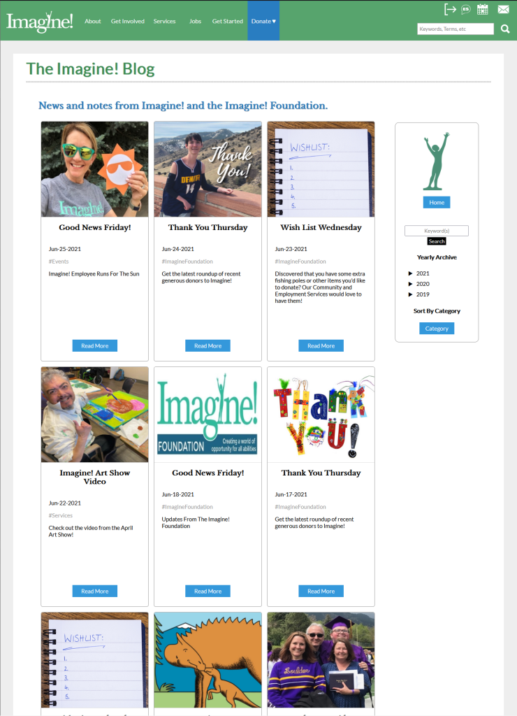 Imagine!, a nonprofit that serves people with disabilities in Colorado, was transferring their blog from Blogger to their organization’s website. They wanted to have all of their publications on the same site to increase accessibility and allow users to explore Imagine!’s services after reading a blog post. Additionally, they found that the reader count was not quite where they wanted it to be on Blogger, so their hope was to increase views on the main website.