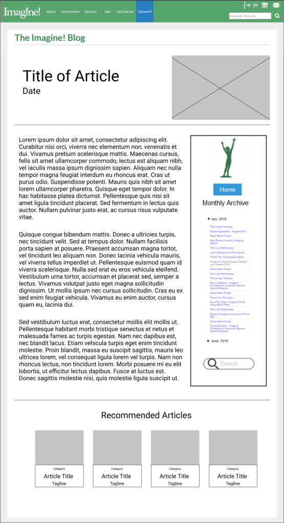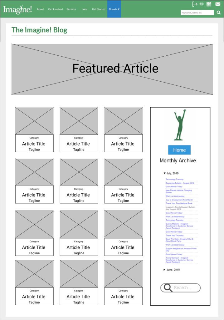 I created a medium-fidelity prototype for the webmaster at Imagine!, who then built the new blog around that design. You can view the prototype by clicking on the following link: Imagine! Blog Redesign.