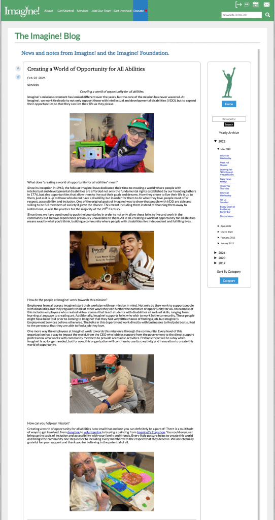 We like to remind the audience of Imagine!’s mission and why it’s essential. Before this blog post, we would share photos or snippets that would touch on this topic, but we decided we needed something more concrete to share. I researched a bit of Imagine!’s history and discussed my target audience with the Director of Public Relations. I used HTML and CSS to code the post and line all the elements up nicely. Additionally, I personally took all of the photos except the tarantula one. We wanted to direct this message to all of our stakeholders, whether they are potential donors, clients, or volunteers. To reach a wider audience, we shared this post on all of the Imagine! social media channels.