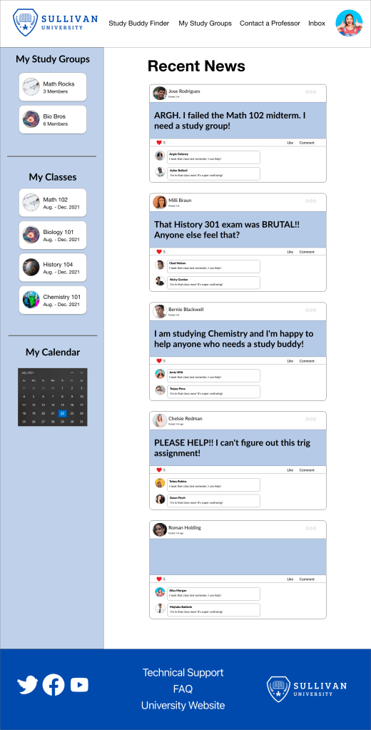 As with my previous projects in this certificate program, I started by trying to get a better picture of the challenge. My problem statement, “Students at Sullivan University need to find study buddies to help them pass their classes,” helped establish my direction and focus. While I had limited time to do research, I was able to do a quick competitive audit, surveying companies such as LinkedIn, Facebook, and Mooclab. There weren’t many study buddy finder applications that I could find, so this audit was slim.
