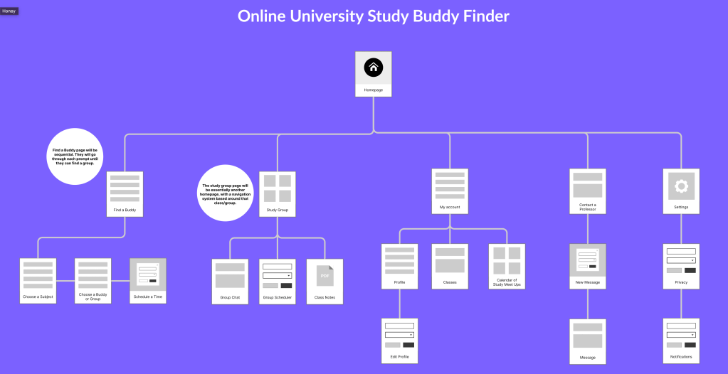 Next, I created a sitemap to outline the hierarchy of pages and get a better glimpse of the flow I had planned for my users. You can view that sitemap below.